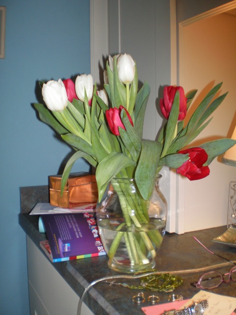 I also got tulips delivered to my office yesterday. Since we are closed for the next 4 days, I elected to bring them home for myself. It is amazing to me that you can get tulips in December. They do not even grow in Florida. Actually they will grow if you buy bulbs in October and refridgerate them for 6 weeks and then plant them….they might bloom. After the bloom, you have to dig up the bulbs and store them until next year in the fridge. Seems excessive and all the more reason to delight in the ones that came yesterday….hot house flowers. I put them in my new room next to where I work. We get all kinds of stuff delivered to the office in the holiday season, mostly food baskets. I let the staff pick through those and take what they like. My medical assistant called me a food snob yesterday……I admit I am picky and prefer to buy snacks for myself. But flowers…..unless they are paperwhites….I will never pass up.