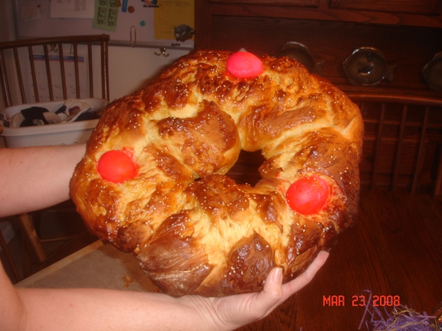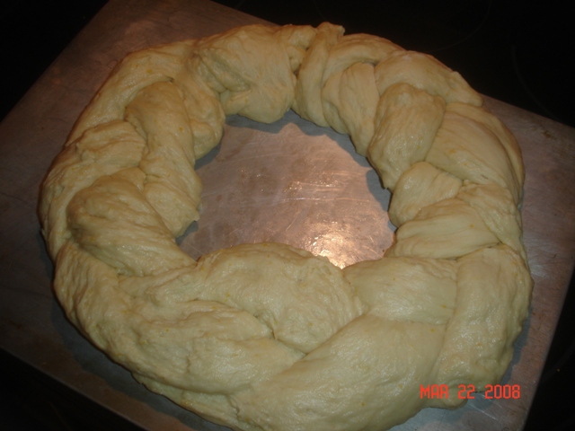 I let myself get beyond frustrated yesterday. On the eve of the Easter morning, my frustration lead to doubt. I was trying to make Easter bread. It is a Greek tradition, this brioche type bread. It is baked with deep red dyed Easter eggs in the wreath. It is a symbolic bread. The yeast makes the bread rise , just as Jesus will rise. The three eggs symbolize the Holy Trinity, three in one symbolized by the circular wreath.  Their color symbolizes the blood of Christ. The bread is a braid of three ropes of dough, also calling to mind the Trinity.