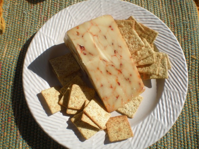 Ooooh, it is good. Sharp and tangy like the best cheddar and then the heat of the peppers. I had a nice little appetizer of cheese, crackers and an apple while I grilled chicken breast. The chicken has been cut into strips and is soaking in Yoshida’s. I will make a big salad and have a thick slice of bread with a glass of Reisling.