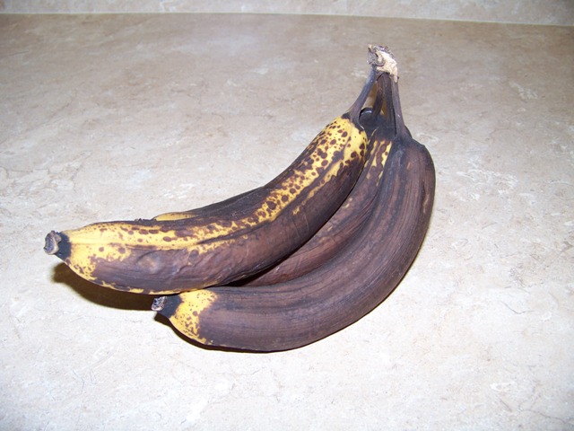 What do you do with bananas way, way past edible? Unless you are of a Caribbean descendancy, these go into the trash. A boy I went to high school with would eat these. He cut them in half and ate them with a spoon. GAG! I do not eat fresh (or rotten bananas). After sitting behind the Nelson’s house with Joey and Scotty and eating nearly a whole stalk of fingerling bananas…that were not quite ripe….and getting violently sick…I have never peeled and eaten a raw banana. I fed them to my babies. Cam still likes them.