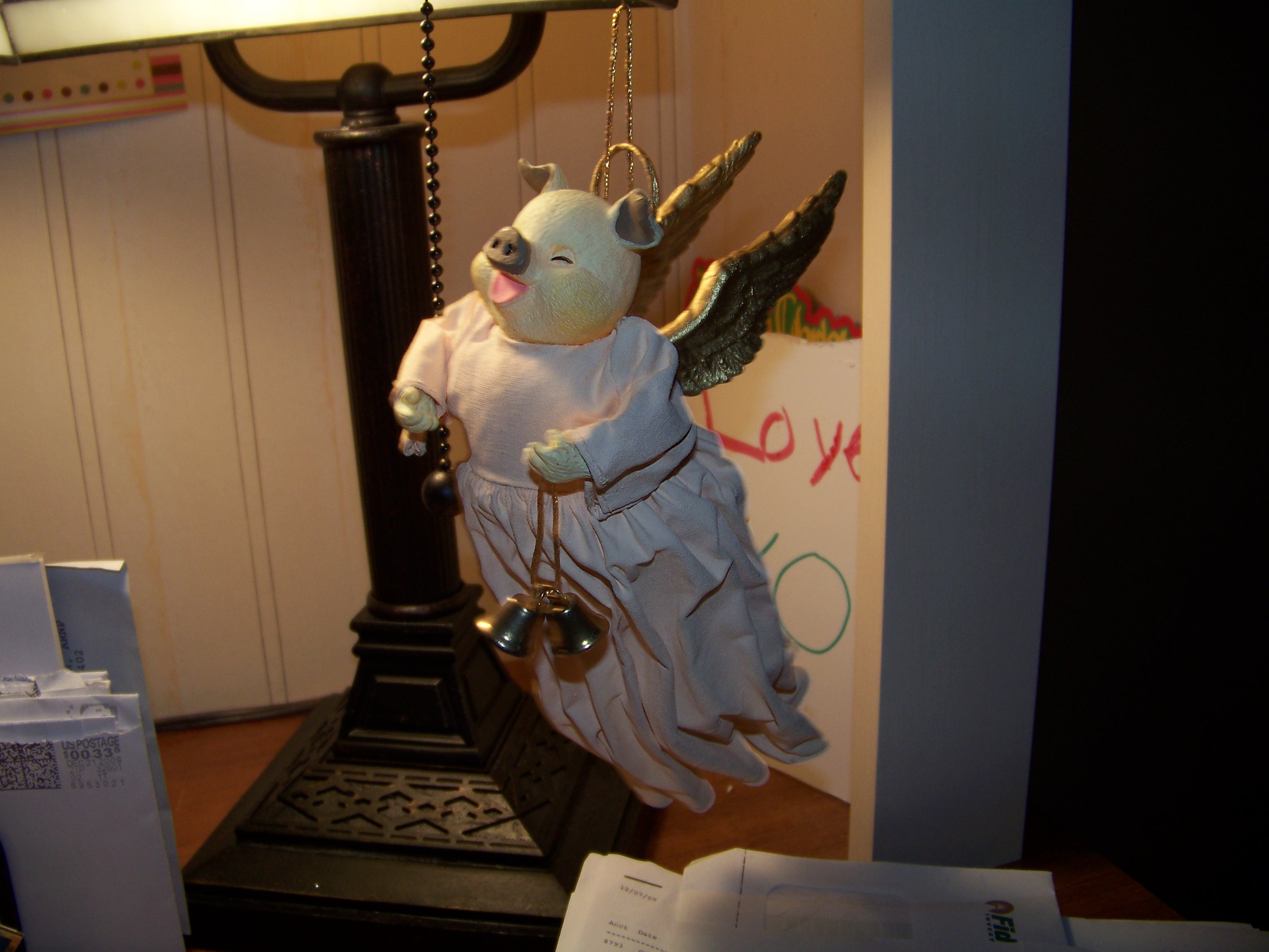 My Evan thought it appropriate to get a new Christmas ornament of a pig since we had Swine flu this year. He called it a Swine Angel. Thank you Miss Janis.