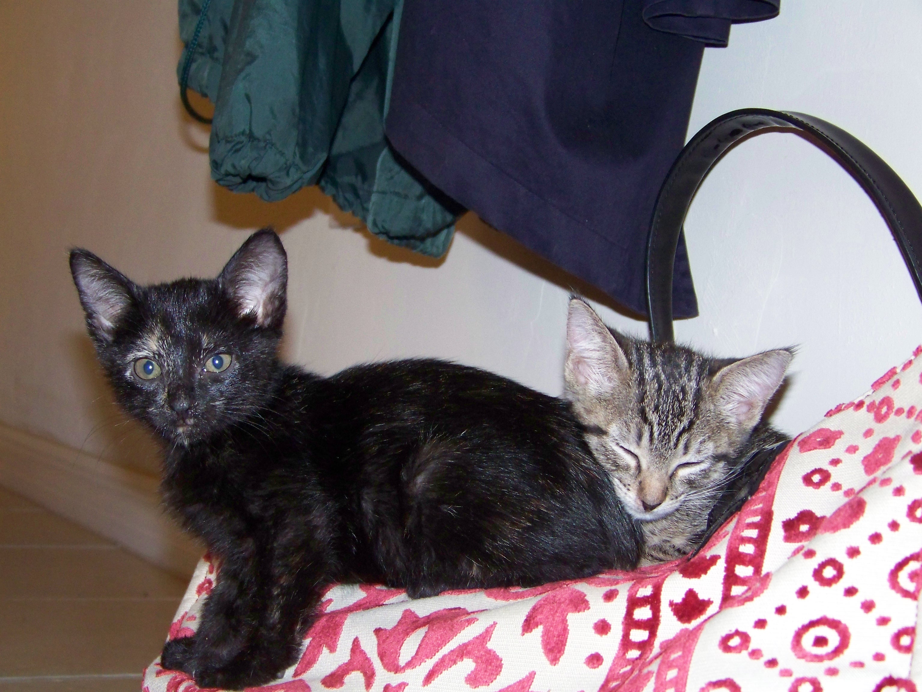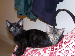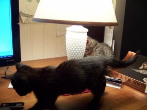 Less than a year ago, we adopted two little kittens. We found the notice for free kittens on Craig’s list. I was thrilled that one was a brindle. We named them Dagney Taggert and Caprica Six. They are delightful. As babies they were fun and inquisitive.