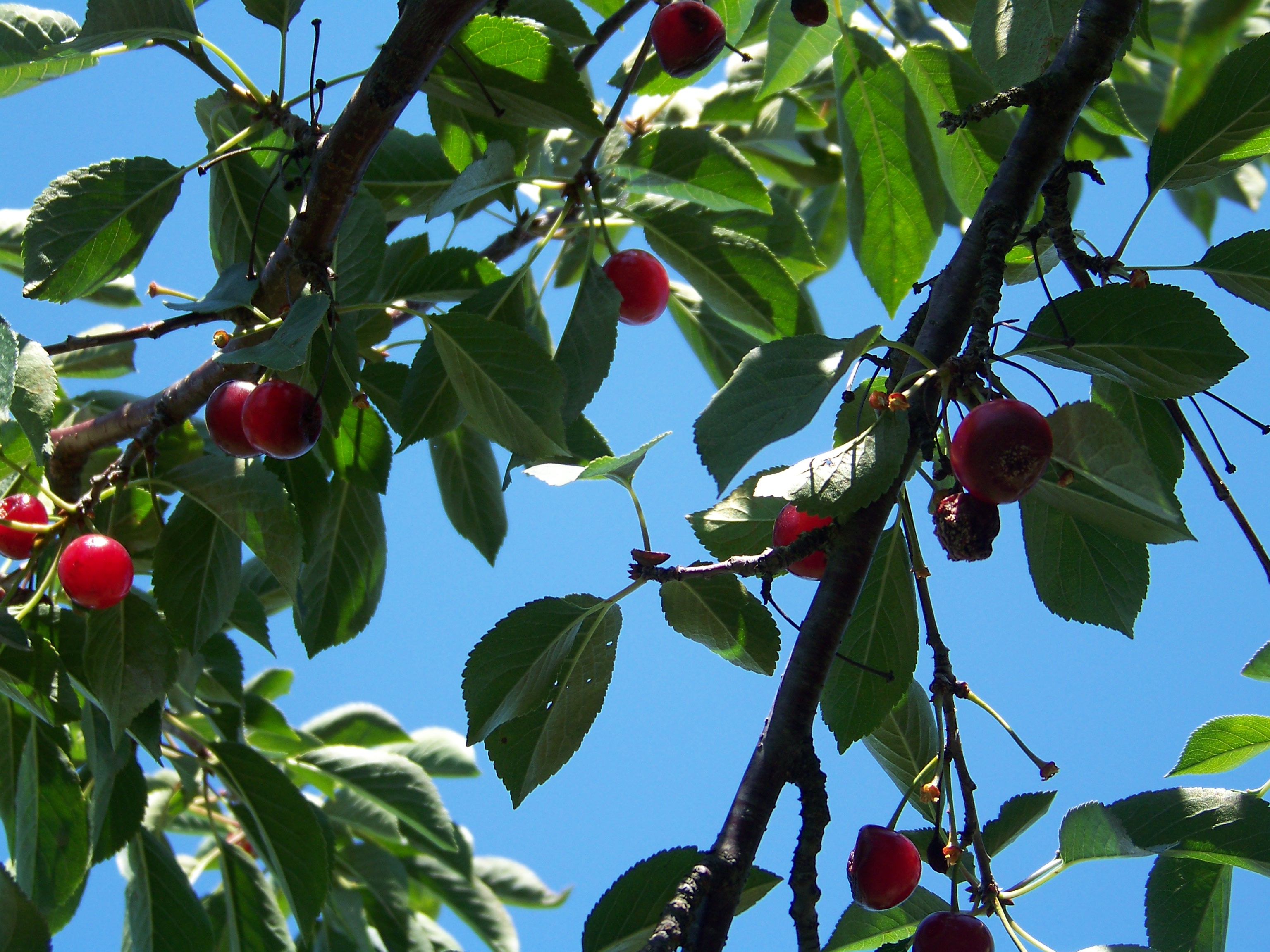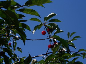 One of the tings on my bucket list has been to go to the Upper Peninsula of Michigan and pick cherries. I have bought dried tart cherries from American Spoon Food‘s catalog for years. The July 4th weekend is the Cherry Festival. Needless to say, lots of people have made the cherry festival and the U.P. an annual trek, much like lobster season for Floridians. Getting a decent and economical hotel for the holiday weekend was not possible. So….it was a nice discovery that there are other cherry orchards in Illinois. On Saturday, I went with friends to The Harvest Time orchard and did U-pick cherries. Because there had been a late April freeze, the harvest was microscopic compared to normal, but we still managed to get enough sour cherries to make 8 half pint jars of sour cherry preserves. I like to have sprained something climbing up into the interior of the cherry trees to pick berries. I can imagine a child spending far too much time climbing into the trees and gorging myself on cherries.