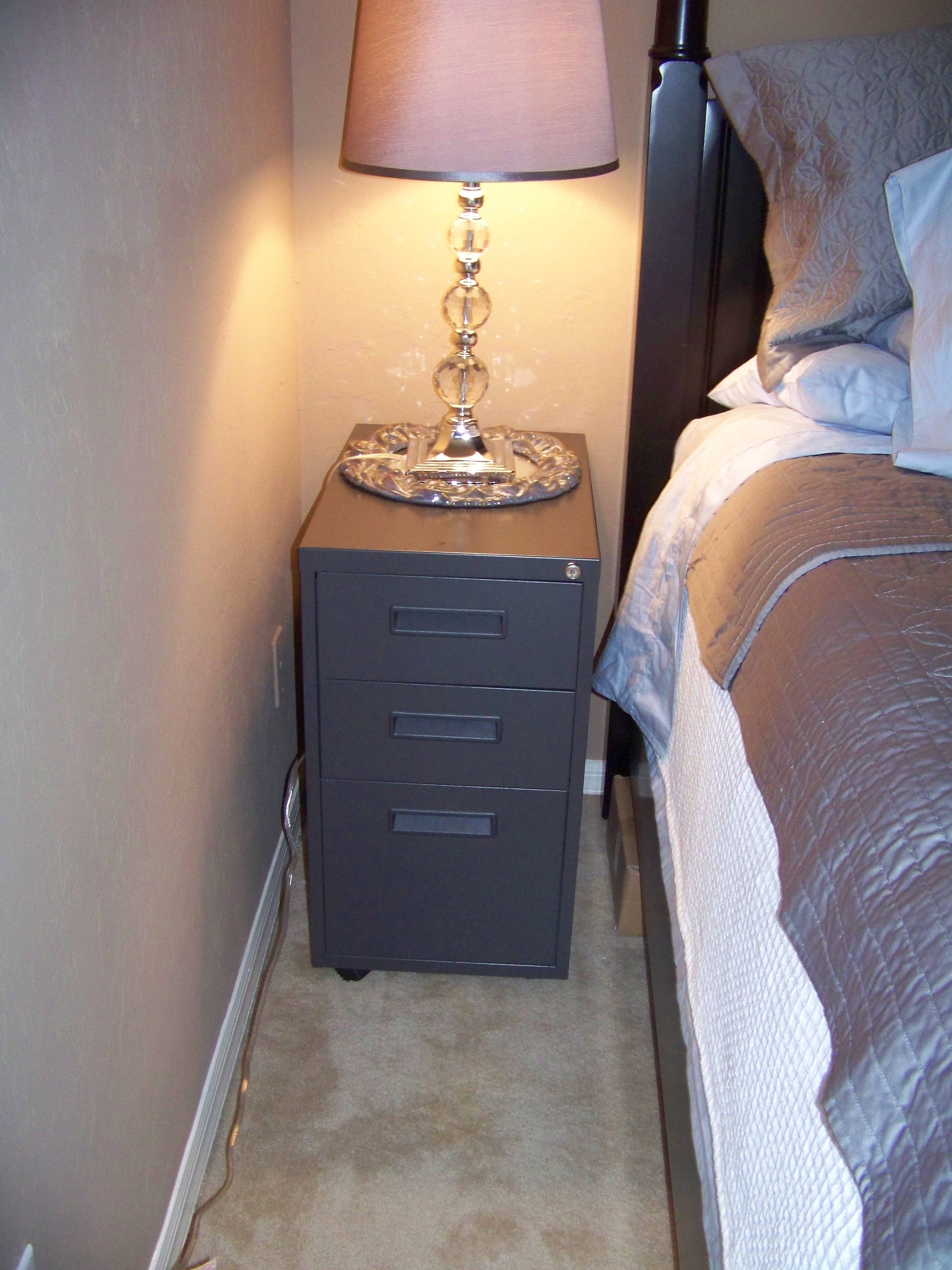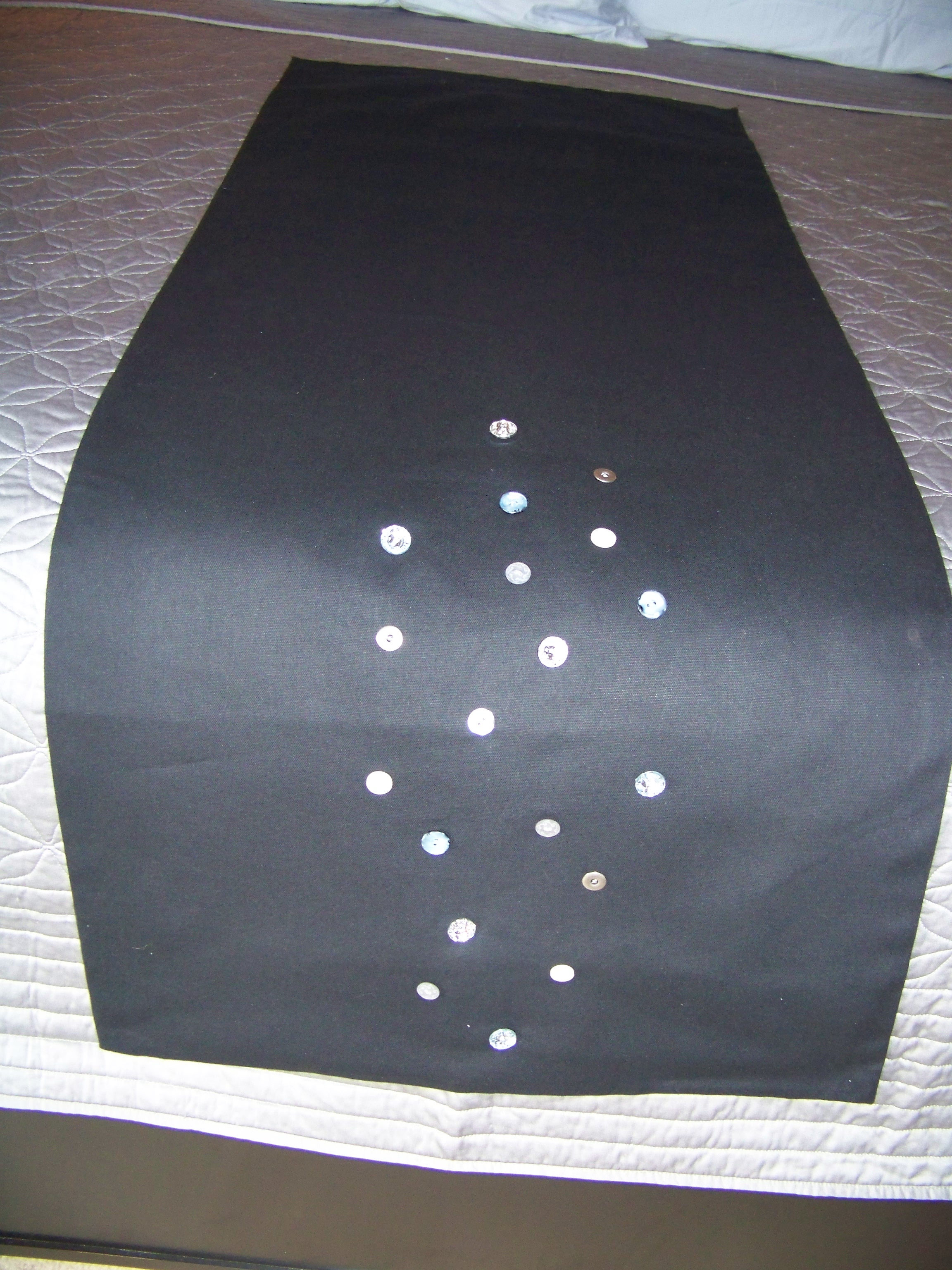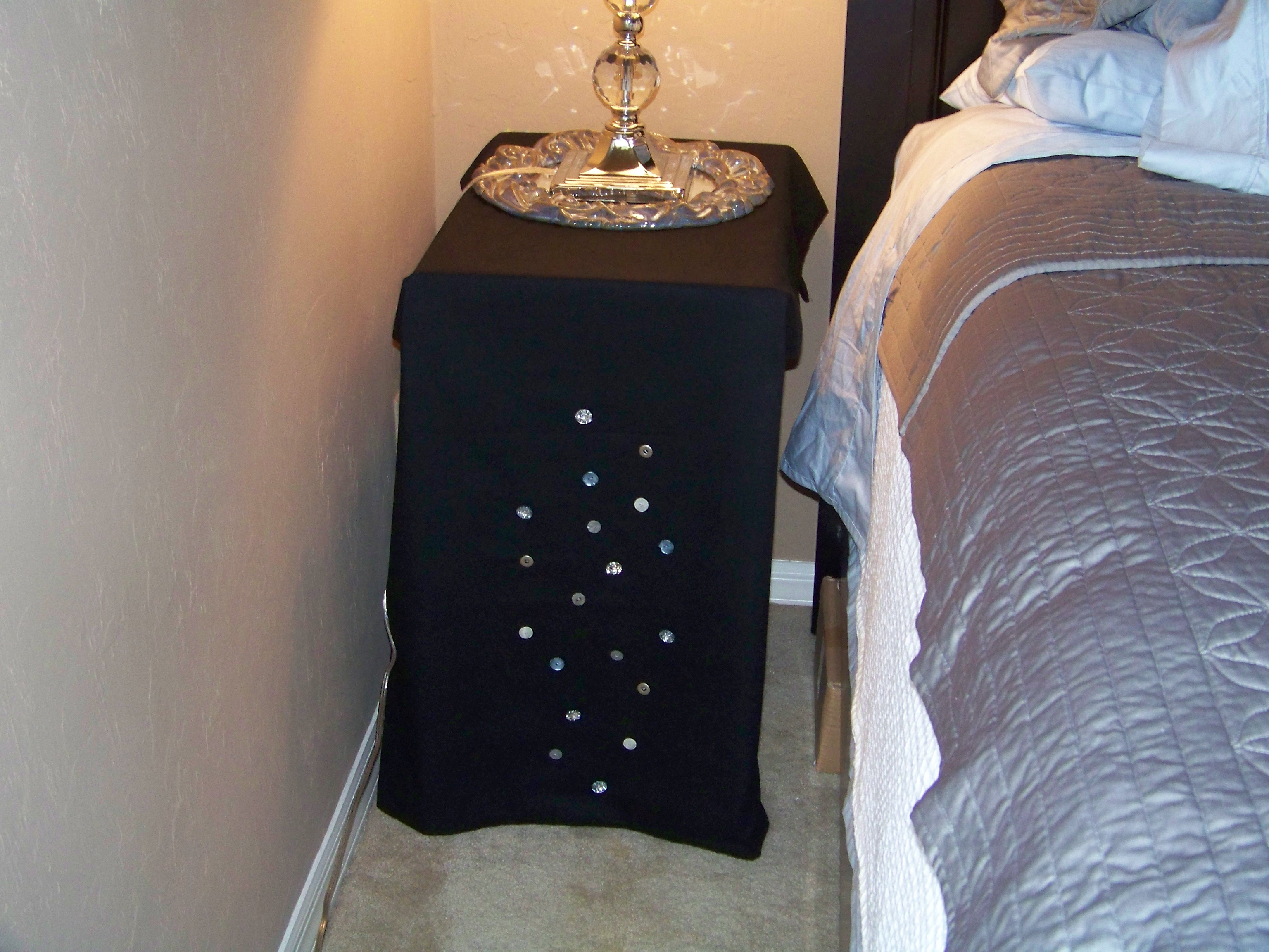 My second project is something I think is a bit of my forte. The homemaker extraordinaire. I do not have a full set of bedroom furniture. I am buying the Bassett set piecemeal and in cash ala my credit has been destroyed in the divorce. So, I save a small amount each month and make my purchases. First the king sized bed frame, a much needed purchase when my “baby” weighs 110 lbs and is still wanting to snuggle in with me in the middle of the night. This usually means him sleeping diagonally and me relegated to the top corner of mattress. The frame stood sentry beside the double for a few months. I recently bought the mattress on sale…it helps to have 50,000 college students descend on your town with their parents, all setting up their apartments. $ Sale $. But I only have one night stand. What to do? I moved my metal filing cabinet into the room. Proper height, hideous aesthetic. I was not going for Eastern Block border guard house decor. So, it had to be concealed. And what I came up with is a short runner of black heavy weight linen found on an end of a bolt on a sale table. A dozen random buttons that E helped me select and I had a free hand project. And Voila!