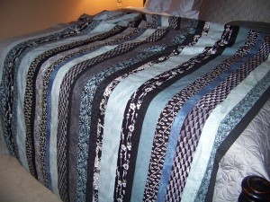 I spent this weekend working on two sewing projects. One has been a concept project rattling in my head for months. Much like my fixation on a particular color blue when I was pregnant with Cameron, I have been fixated on this quilt. When I was pregnant, I must have searched every quilt store and fabric retailer looking for the shade of blue for his angel quilt that was wedged in my brain. The ladies at the Summerville quilt store were very accommodating and likely pulled every bolt of cloth in the blue family for my quest. The ladies at the Trenton quilt store did the same when I finally went off in search of my palate of colors, armed with a throw pillow. Every task must be broken down into steps. And after making many quilts, I know better than to skip or improvise. Quilting is not like cooking….at least not my cooking. I never follow a recipe. If it asks for three gloves of garlic, I add six. I embellish, knowing the flavors I prefer; I improvise. But even in cooking there are standards. How you grease and flour a pan is standard and gives a result wholly different than Pam. In quilting it is much the same. All seams are sewn at 1/4 inch. ALL. No variation. This is different than the pattern piecing seams of 5/8 inch. I mean, honestly….5/8 inch. Why? I ponder this everytime I sew a regular pattern. Also, seams are ironed one way, not split open as in dressmaking. And like Malcolm says, 10 years or 10,000 hours makes you an expert. I have the ten years, certainly, but condensed, I am likely short…way, way short…the 10,000 hours. But, every quilt I make gets easier and better. I am sewing on the same Singer machine I have had for more than 20 years. I covet an new Bernina, but I do not need the Ferrari of sewing machines. I am not a Formula 1 racer and given the chance to drive one, I’d either crash into the wall or drive the track like a blue haired lady. I do just fine on my Singer. This is as far as I got….six more strips to add to the top.