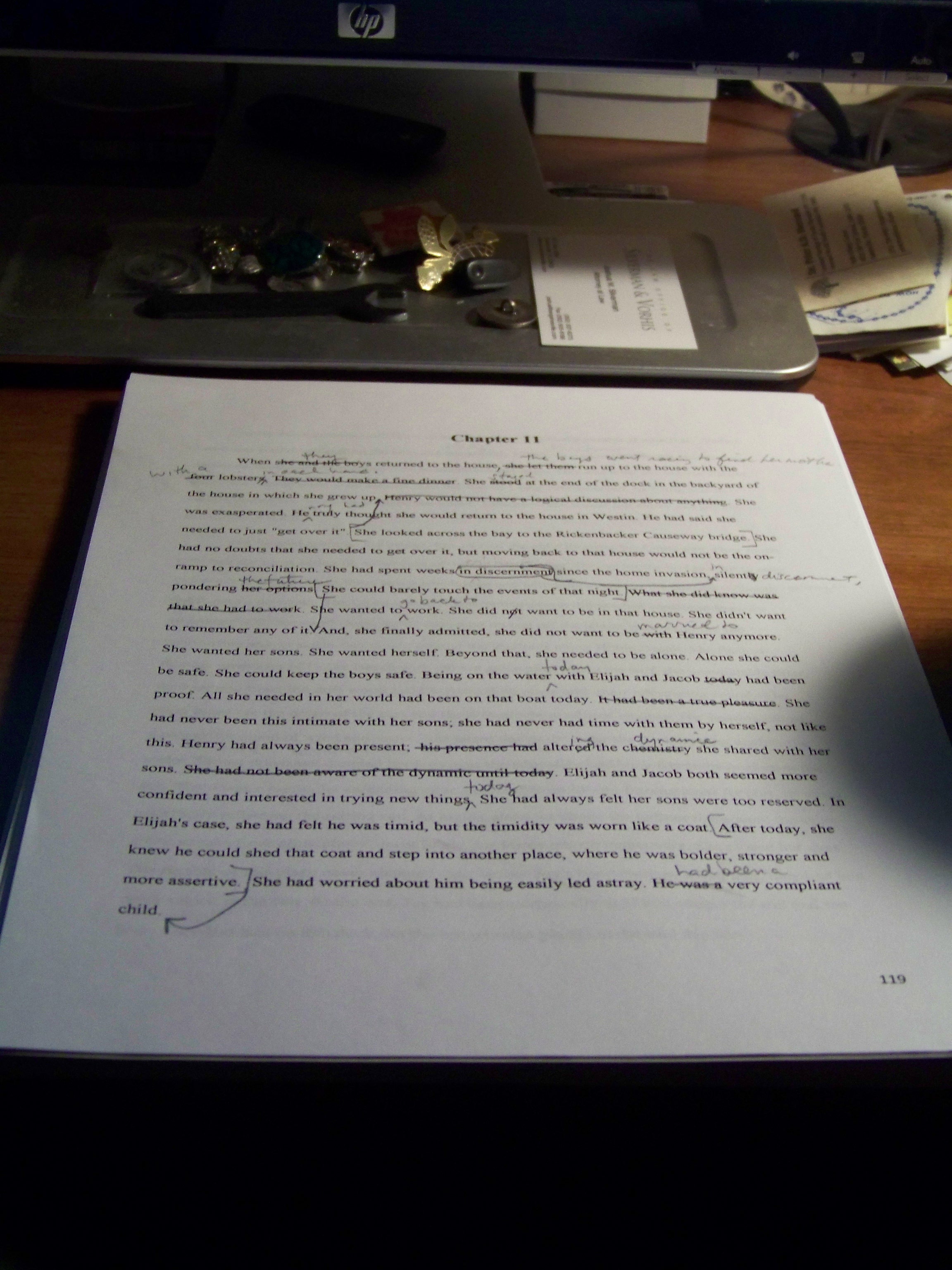I spent the evening editing. I am 100 pages into the book that once topped out at 670 pages and I have cut 4,000 words. At that rate, and I expect the middle space to be fattier and easier to trim. This early part has been written and rewritten the most and is more marbled, harder to get conditioned. I have to focus only the things that develop my main character and the plot lines that push her narrative along. I don’t want to eliminate all the adjectives and examples of who and how she came to exist, but I need to let the reader learn about her as they read. No spoon feeding.