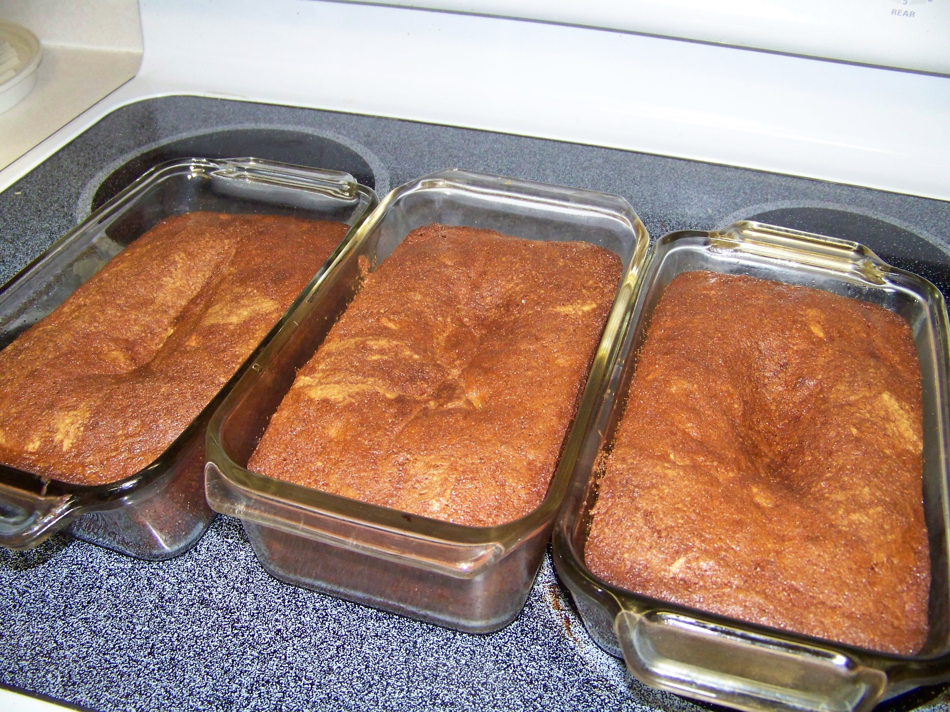 The banana bread is out of the oven. It smells lovely. The center fell slightly in all three loaves. Ugly baked goods still taste awesome.