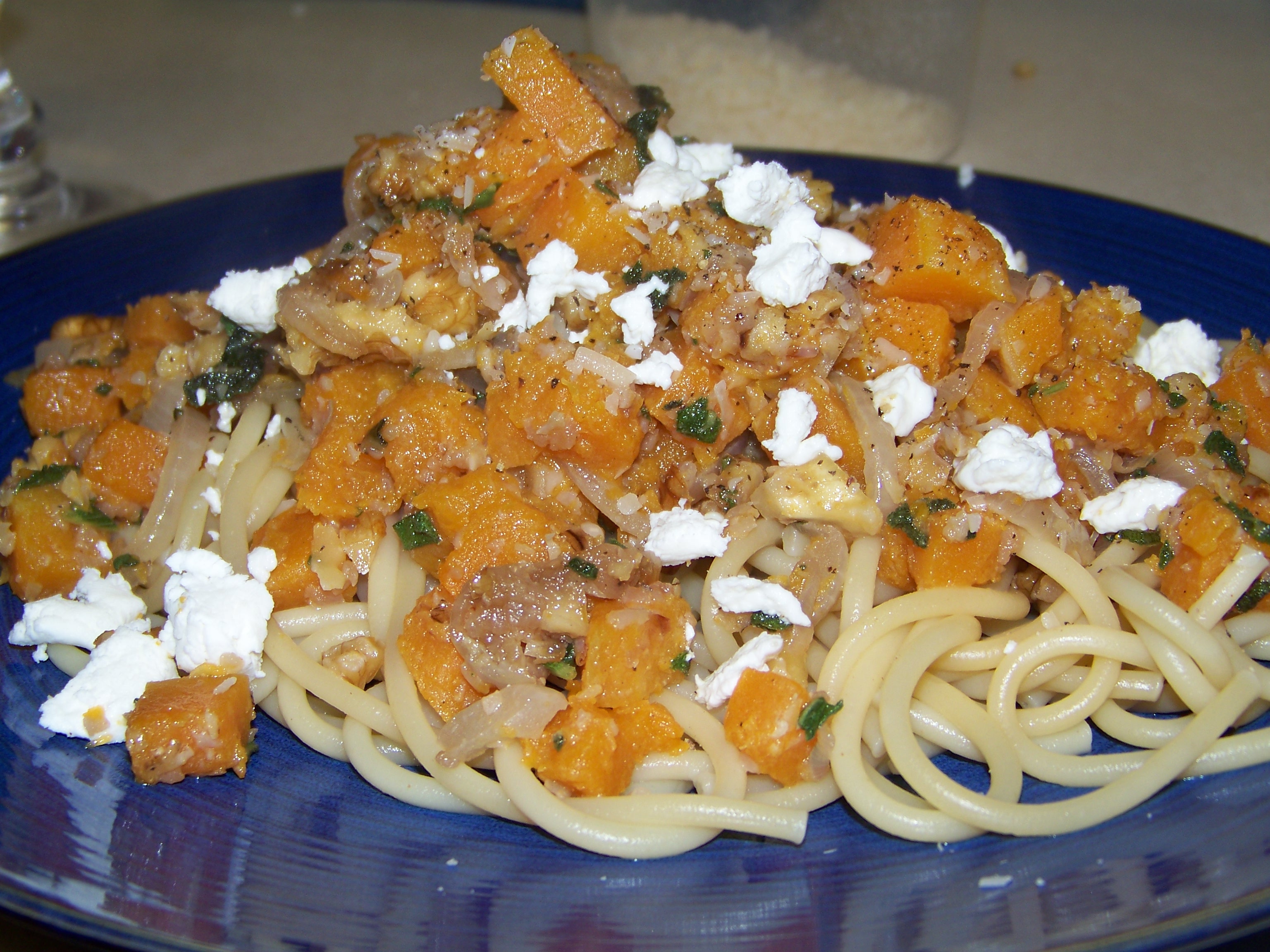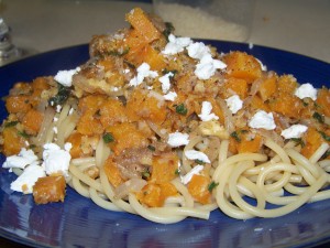 Roast the butternut squash in the oven for 40 minutes, cut side down in a pan brushed with olive oil. After letting it cool completely, dice it into small 1/2 inch cubes. I used only a fourth of the squash. I sauteed a sweet onion until translucent, added a teaspoon each of butter and sugar, four crushed garlic cloves, 1/4 cup of chopped walnuts, a dozen chopped sage leaves. Once the aromas were strong, I added the squash, seasoned with salt and pepper and tossed until thoroughly heated. I put it over bucatini pasta and garnished with a tablespoon of goat cheese crumbles and a teaspoon of grated Parmesan.