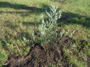 Arbequina Spanish olive trees, that I bought at Olive Growers Farms in Dunnellon, Florida. I drove down there and stuffed trees in my little car. I planted the smaller 1-gallon trees this Sunday. I planted the larger 3 gallon the weekend I bought them. They get watered each day at the job site.
