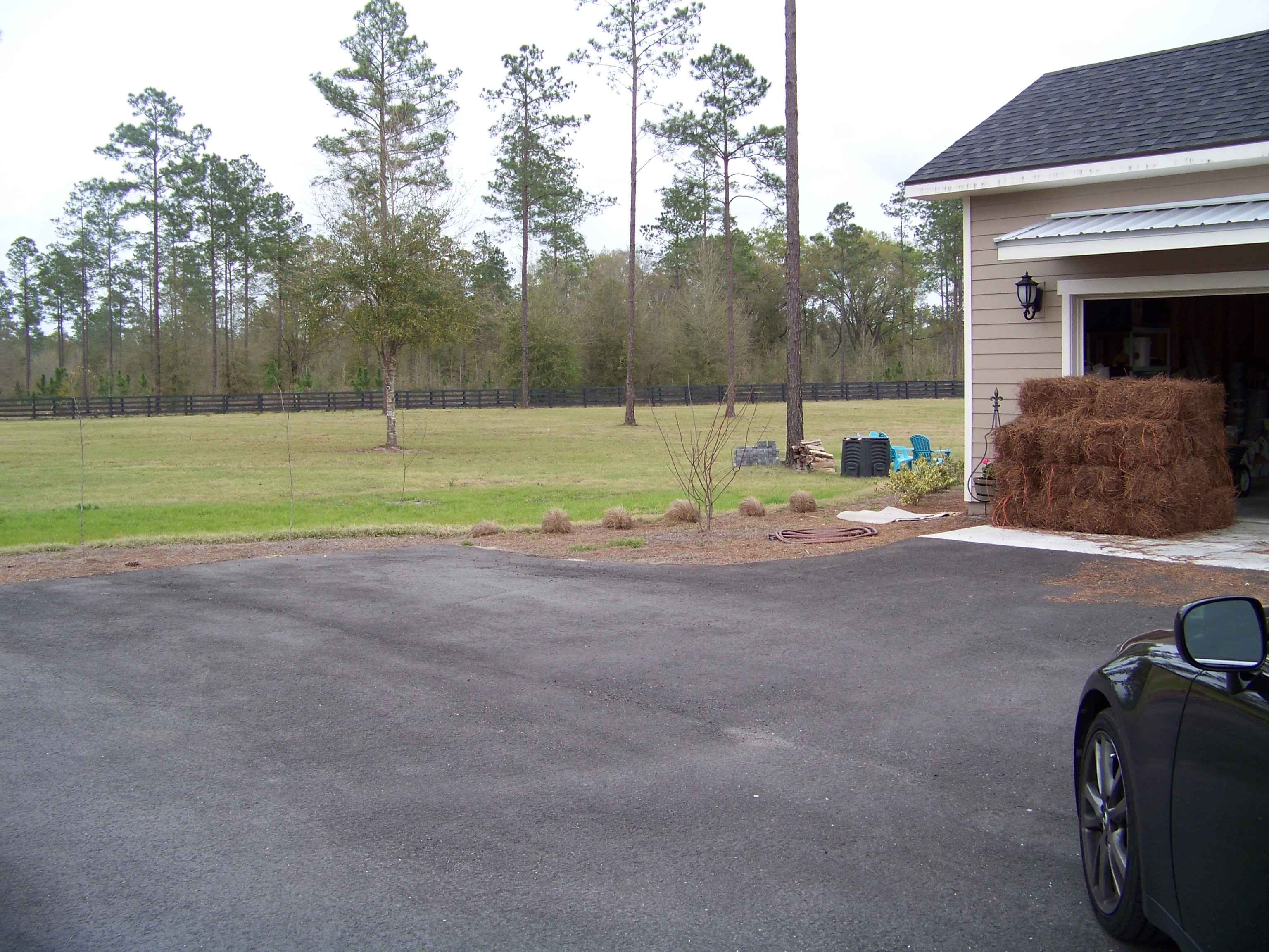 On Saturday I stopped at TNT Nursery and bought 30 bales of straw and their largest loquat tree. Prior to delivering them today, they called and asked where to put everything. I specifically said ON THE DRIVEWAY, at the end in front of the red bud trees. I figured that the guys that work at the nursery could identify a red bud tree when compared to a GARAGE DOOR. It’s kind of a basic Sesame Street “this things is not like the other” test. So, I pull up in Teacake and hit the garage door opener and the bales proceed to fall over sideways and knock over the planter and the new geraniums. I spent two hours moving and spreading the first six bales. Oh, and the loquat tree is NOT the tree I bought. So tomorrow they have to deliver the proper, larger tree. As penance, they offered to plant the loquat tree if I would just mark the spot. I figure if they cannot distinguish between the door and the driveway, I can’t be sure they’ll dig the hole where I mark the “X”.