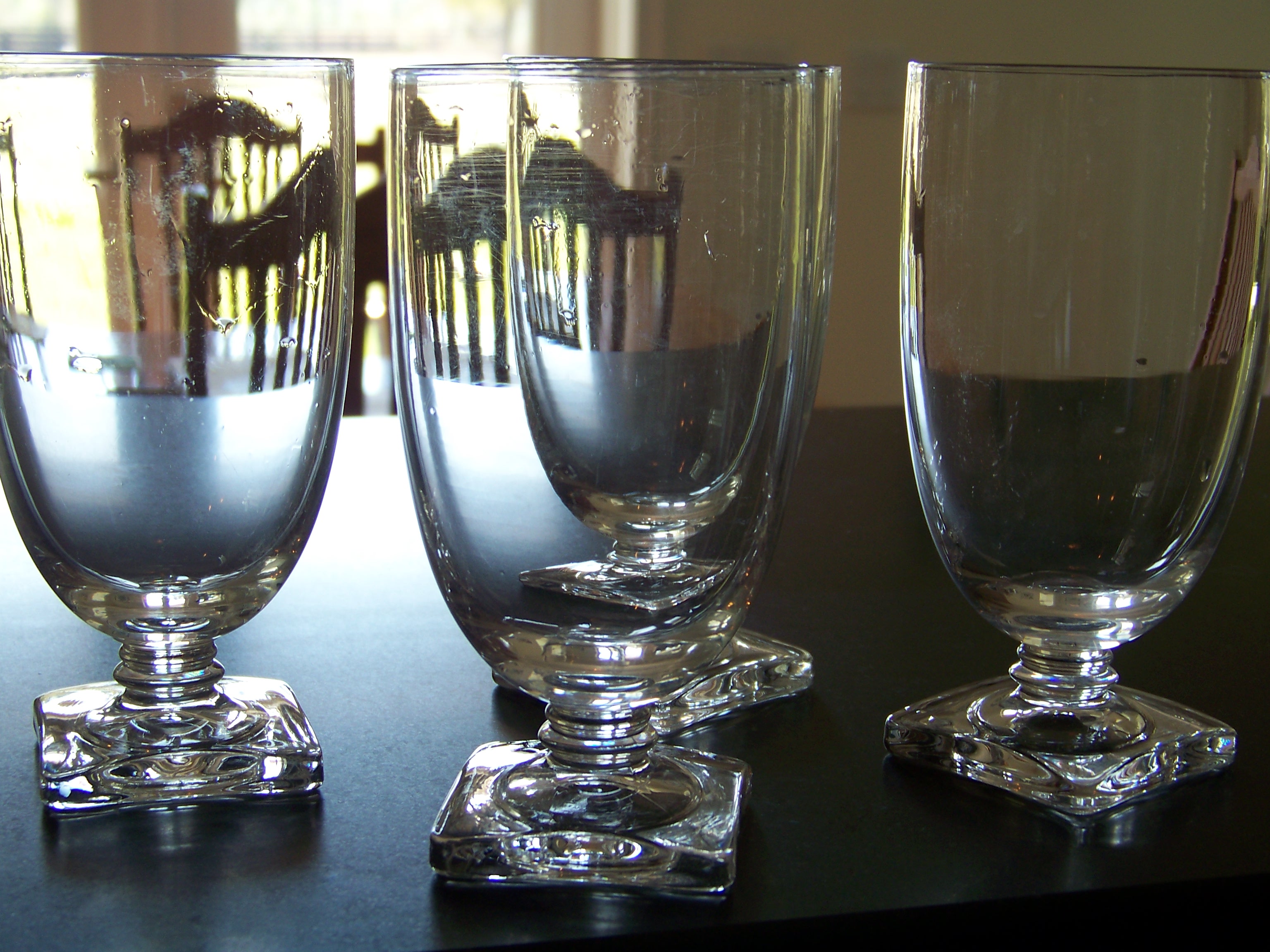 These Cambridge Square glasses match the house perfectly because the feet are square like all the faucets and escutcheons in my house. The bonus was finding smaller companion juice glasses on Ebay.
