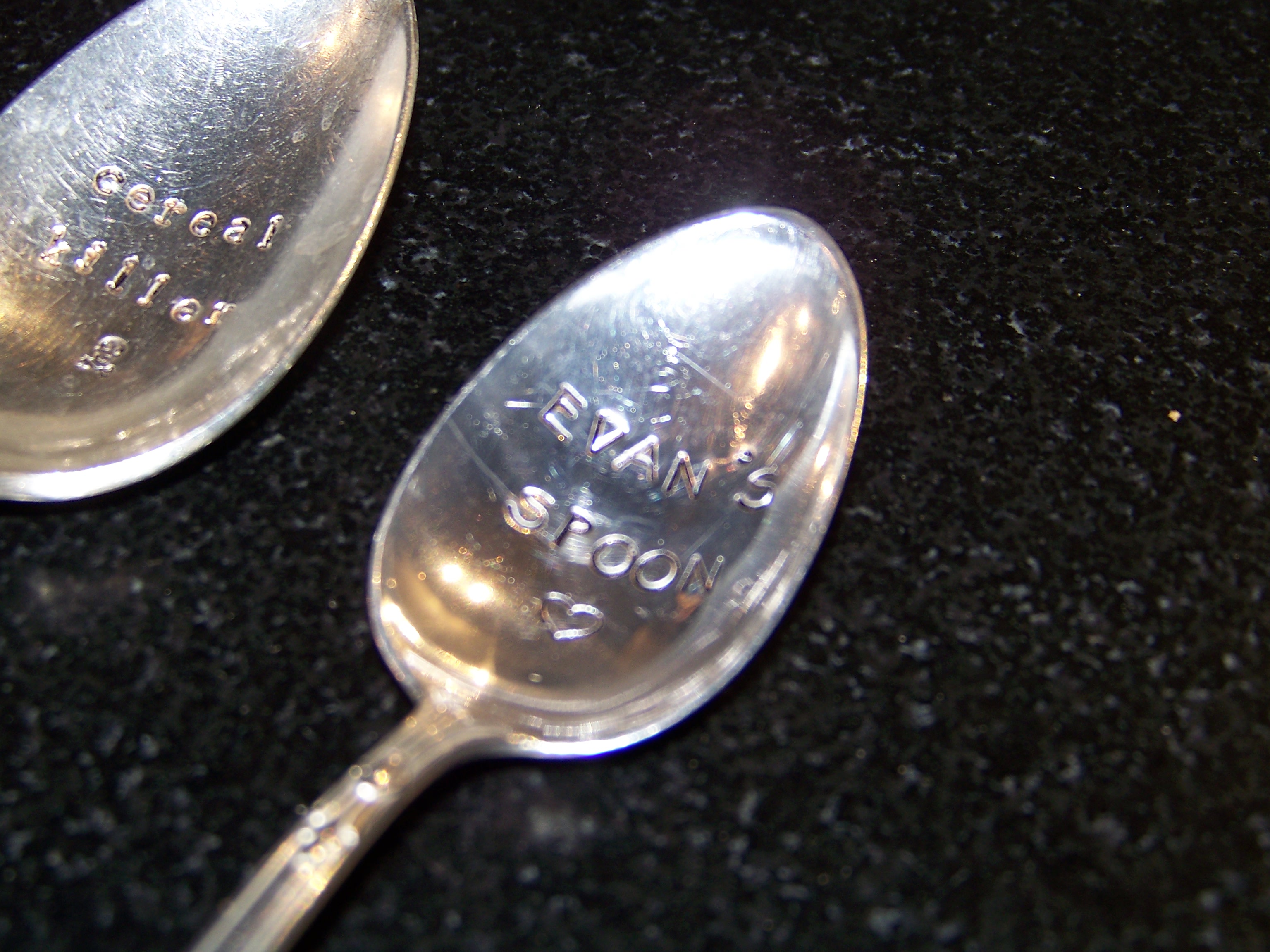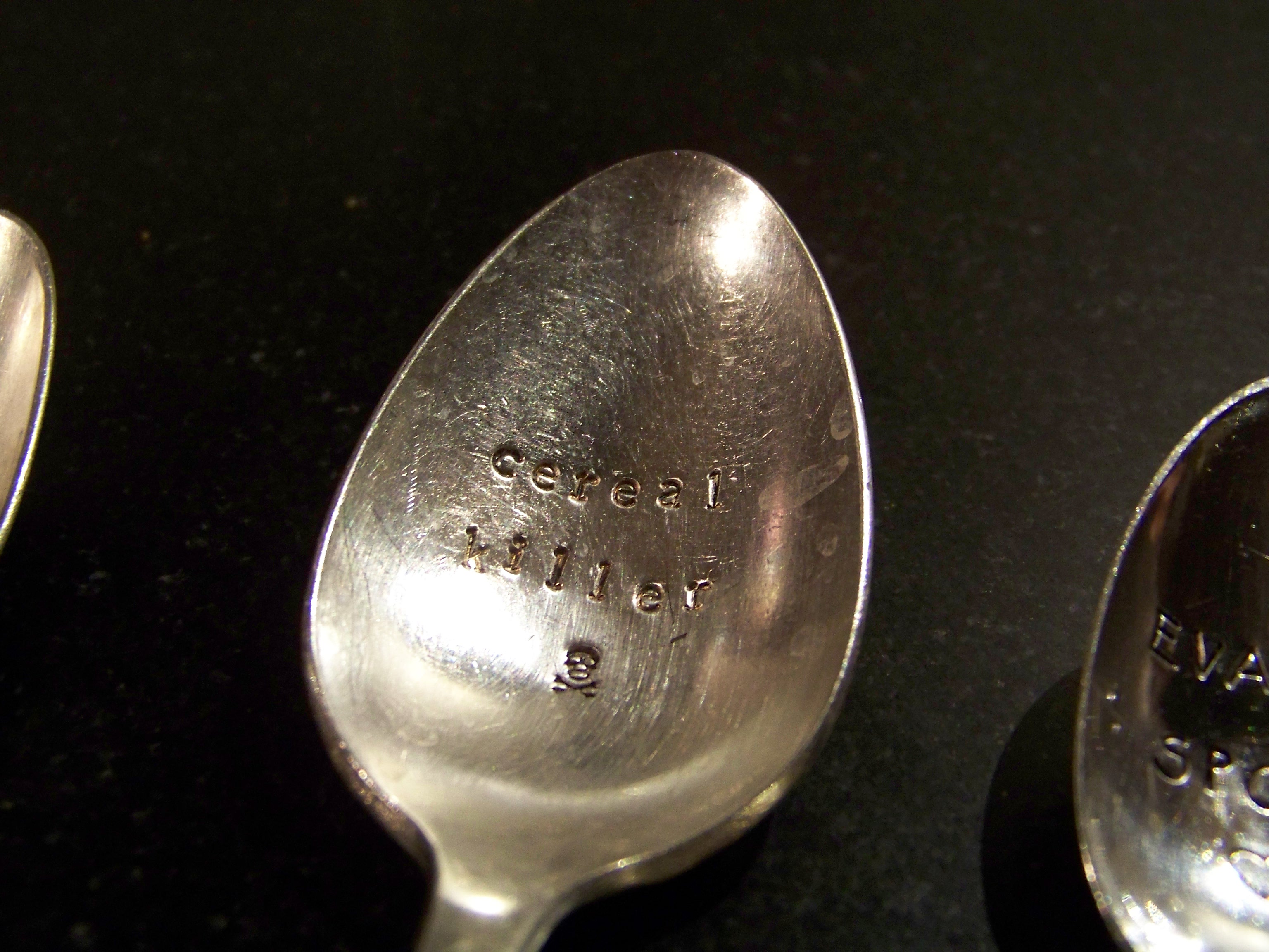 - On Etsy, there is a shop called Milk & Honey. They sell stamped spoons and forks. I bought my oldest a large (table) spoon for ceral eating and it is stamped with “Cereal Killer”. Perfect, right? But my younger son seemed a bit left out, so I placed a second order and got him a custom spoon and one for myself.