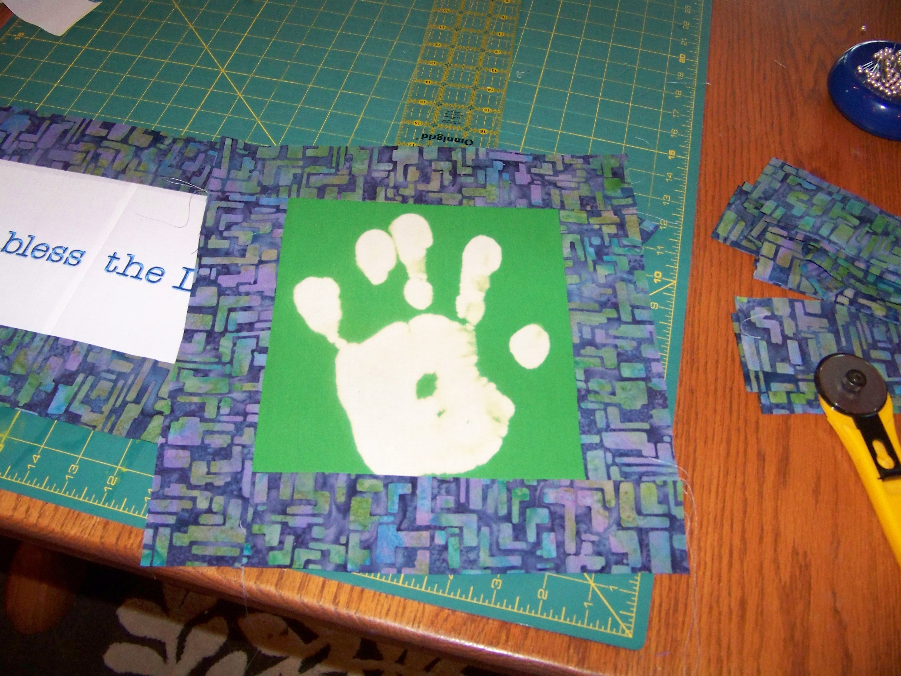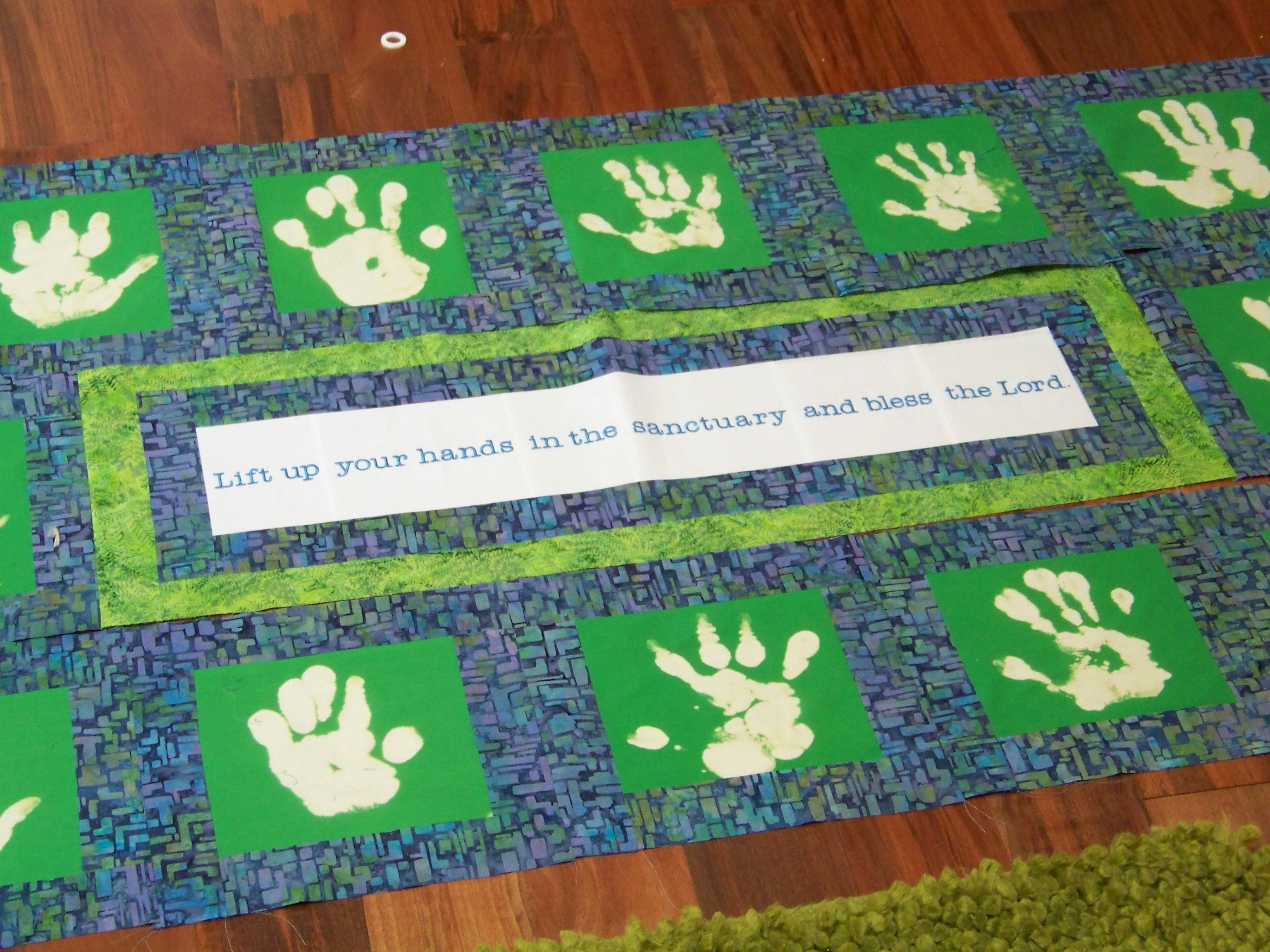 Some days I must do something that fills my heart and lifts my soul AND serves God. I feel like much of my day to day serves God (or at least should) and when I become aware I am not aligned with His plans for my day, I try to refocus. If I am off work, like I was this weekend, I DO SOMETHING. I offered to help one of the teachers at school in anyway possible if they needed my sewing skills. She had an idea and I kind of ran with it. They wanted to use a piece of scripture in a gift for the school’s parish. Each of the kids did a hand print in paint on cloth but when I started working on assembling that paint hand prints around the embroidered line of scripture, I realized that the altar cloth might one day need to be washed and when washed, all the children’s hand prints would come off. Then I had an idea.