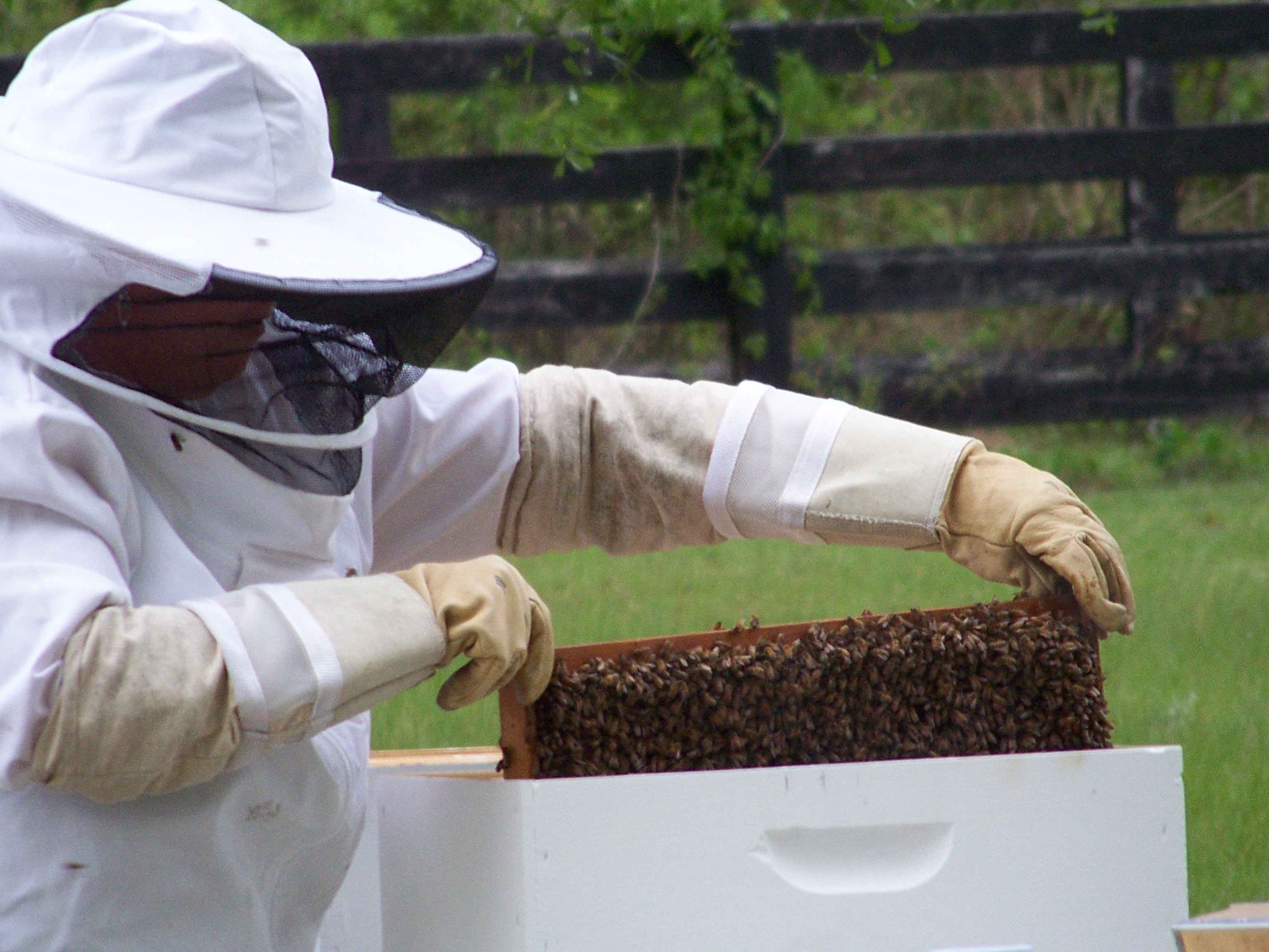 New hiveThe initial jar of sugar water was gone. I’d planned on moving the bees tomorrow afternoon but I needed to get into that box and make sure they were still there. The hive seemed quiet, too quiet. I suited up and brought the larger box out to the elevated rack and set about moving the frames. I tried to find the queen to no avail. I know she’s there because the hive has doubled in size since Saturday. I’ll look for her this coming Saturday. I’ll take more time. I didn’t want to keep the hive open too long because the temperature was dropping. The blackberries have thousands and thousands of flowers so I didn’t give them more sugar water.