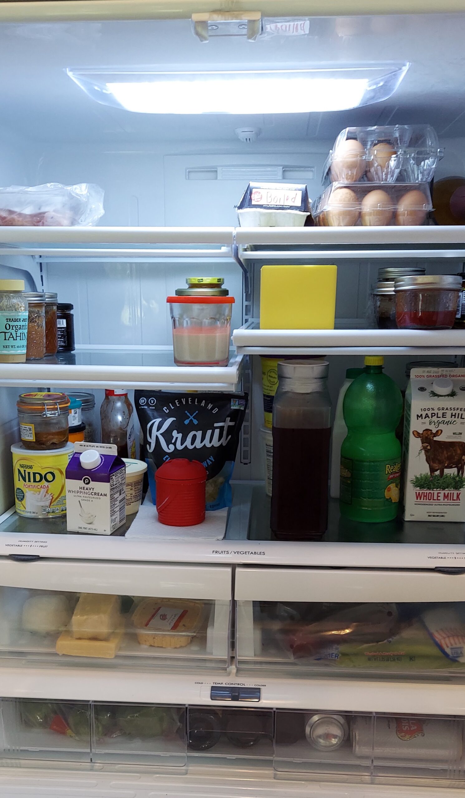 But I love a clean fridge. No crumbs. No drips. The glass is pristine and the surfaces gleam. And I discard all the errant partial jars of old condiments.