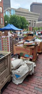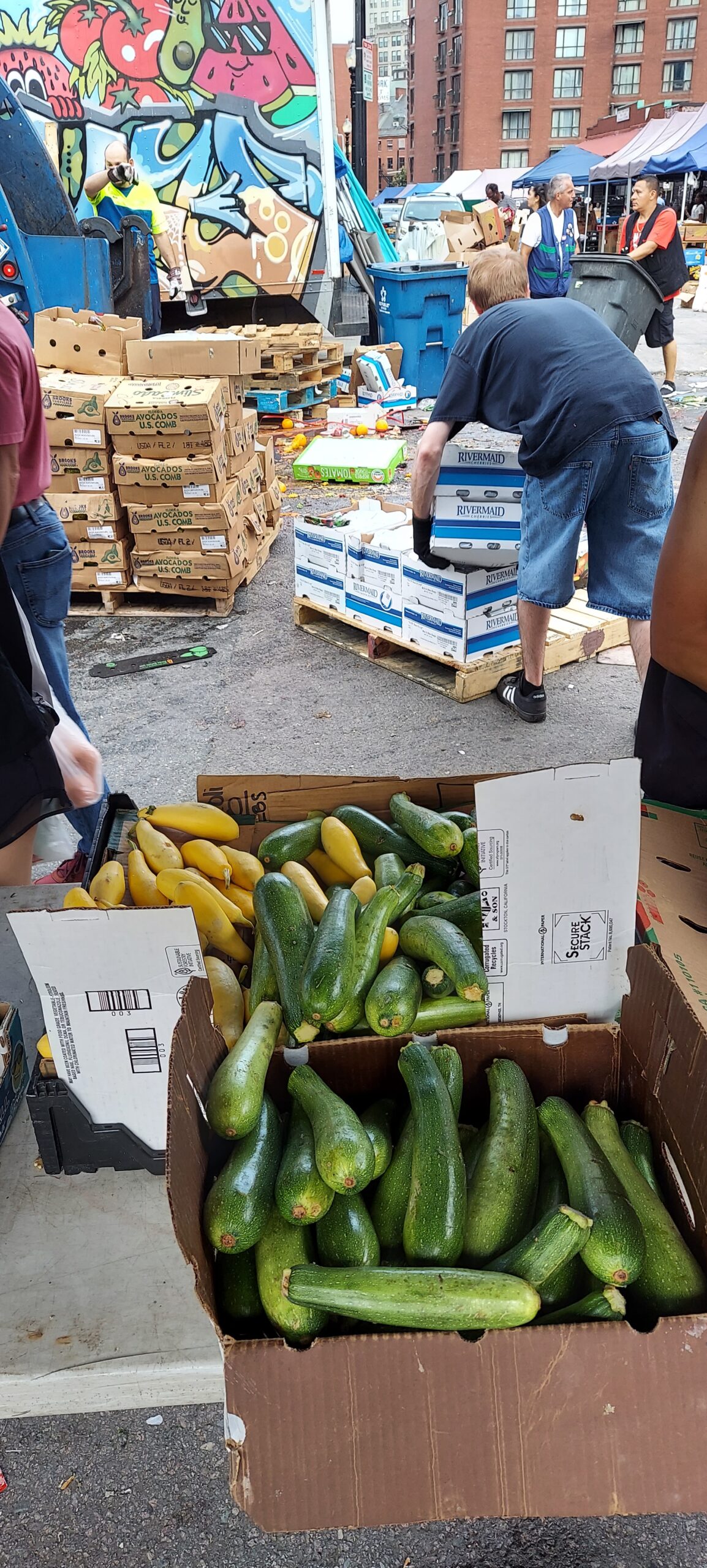 After that we walked back to Haymarket to get the subway back to South Boston only to encounter the END of the farmers market. A garbage truck had arrived and the vendors were quite literally fork-lifting whatever that had not sold to the garbage truck to crush and haul away to a landfill. Mo visible effort to give it to a food bank or a homeless shelter or a pig famer. Entire pallets stacked with boxes of still-edible food wrapped in plastic and stacked in cardboard cartons trashed. It was sickening.